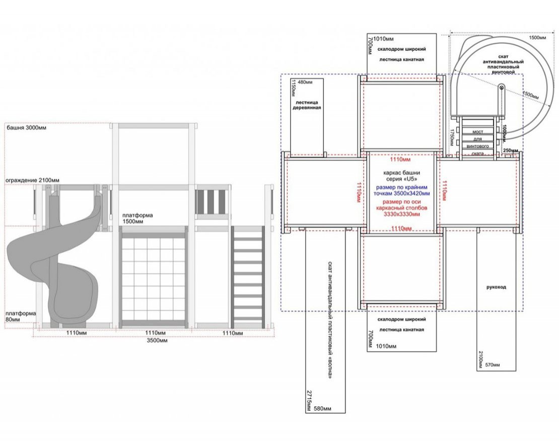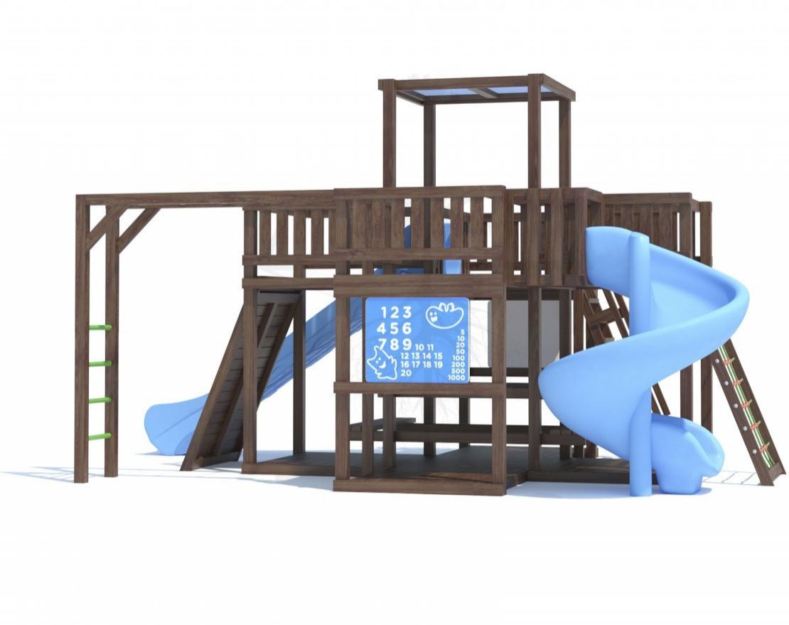 Основа детской игровой - спортивной конструкции – башня и четыре балкона «серия F». Конструкция оснащена плоской прозрачной крышей, встроенным полом, встроенным столиком с лавками в нижней части конструкции, пластиковым антивандальным скатом с превосходной скользящей поверхностью, антивандальным винтовым скатом с переходным мостиком, «П»-образным деревянным рукоходом, скалодромом, канатной лестницей с армированным канатом, деревянной лестницей, антивандальными пластиковыми игровыми панелями. Для безопасности ребенка предусмотрены перила на лестнице, заборчики и ограждения над зонами препятствий (скат).