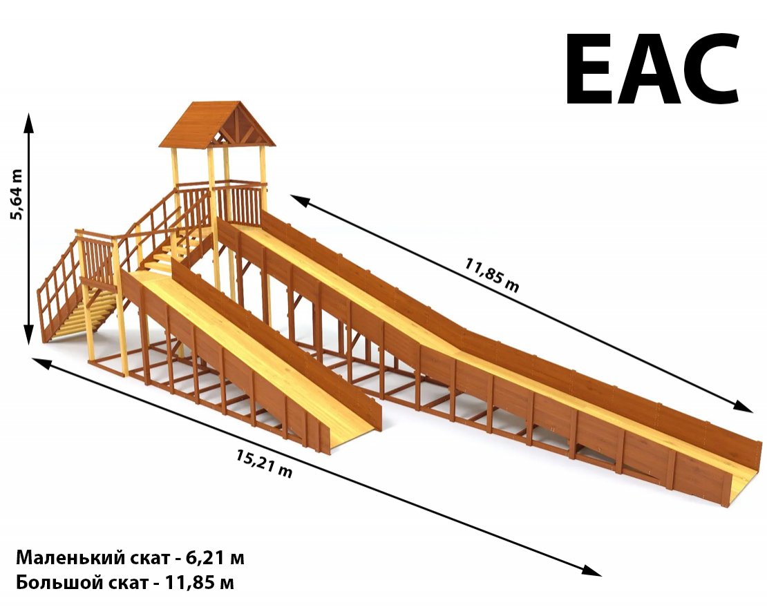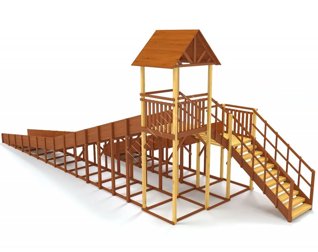 Конструкция тщательно спроектирована и выполнена из качественных материалов, что гарантирует безопасность и долгий срок службы. Каркас изготовлен из надежного клееного бруса, а в качестве защитного покрытия использован лакокрасочный состав с разрешающим сертификатом для применения на детских площадках.